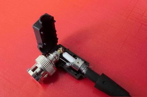 第1步:首先把視頻傳輸線外面的黑色外皮切開,前面的白色泡沫頭部切開,露出一部分監控視頻線芯。