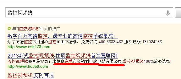 1.國內做網絡推廣離不開百度, 使用百度是國內人們的搜索習慣了,故而有了“有問題找百度,有問題找度娘”。金鱗羽電線電纜有限公司在百度上做的關鍵詞是 “監控視頻線” 如:2.火爆安防網首頁,左邊中部是我司做的推廣 ,若要詳細了解,可直接點擊進入3.南阿里北慧聰,提起阿里和慧聰做生意的都知道的,一個雙十一,馬云就收了好多億在口袋內,阿里是B2B的老大,能夠與它抗衡的是慧聰網的買賣通。金鱗羽電線電纜分別在這兩個平臺上做了推廣,且經過了阿里的實地認證。如果您要采購安防線纜的產品,金鱗羽電線電纜有限公司就是您的最佳選擇。誠信為本,品質如金。
