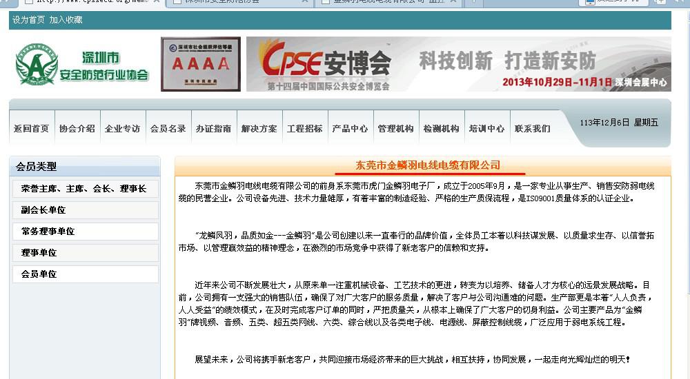 4.2013年(nian)10月(yue)29日-11月(yue)2號中(zhong)國(guo)(guo)(guo)深(shen)圳的全球安防第(di)一(yi)展《第(di)十四屆中(zhong)國(guo)(guo)(guo)國(guo)(guo)(guo)際社會公共(gong)安全博覽會》,東莞市金鱗羽電線電纜有限公司是在2號館的2G10 以下是金鱗羽安防線材在深圳安防行業協會的推廣