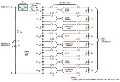 測試(shi)件(jian)(jian)采(cai)用電(dian)池(chi)供(gong)電(dian),或15V~24V的(de)(de)(de)直流電(dian)源(yuan)。穩(wen)壓器(qi)(IC1)接成一個電(dian)流調節器(qi),為電(dian)纜各端(duan)的(de)(de)(de)LED串(chuan)提供(gong)標稱25mA電(dian)流。本例中的(de)(de)(de)電(dian)纜包含八(ba)個雙(shuang)絞線(xian)(xian)(xian)對(dui)(dui),如(ru)果電(dian)纜良好,則測試(shi)件(jian)(jian)上的(de)(de)(de)全部八(ba)只LED(DA~DH是一個條形顯示器(qi)串(chuan)聯的(de)(de)(de)各段)以及終端(duan)件(jian)(jian)上的(de)(de)(de)全部八(ba)只LED(D1~D8)都發光。如(ru)果某個雙(shuang)絞線(xian)(xian)(xian)對(dui)(dui)開路(lu)(lu)或反(fan)接,終端(duan)件(jian)(jian)上的(de)(de)(de)相應LED熄(xi)(xi)滅;如(ru)果某對(dui)(dui)短(duan)路(lu)(lu),則兩(liang)端(duan)上的(de)(de)(de)相應LED都熄(xi)(xi)滅;如(ru)果任何兩(liang)個不(bu)同(tong)線(xian)(xian)(xian)對(dui)(dui)中的(de)(de)(de)無關(guan)導線(xian)(xian)(xian)短(duan)路(lu)(lu),則兩(liang)端(duan)串(chuan)聯的(de)(de)(de)所(suo)有(you)中間LED都熄(xi)(xi)滅。例如(ru),若第(di)4、6線(xian)(xian)(xian)短(duan)路(lu)(lu),則LED DA、DB、D1和D2將熄(xi)(xi)滅。