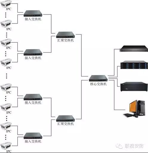 從網絡拓撲結構來講,一個中大型高清網絡視頻監控系統需采用三層網絡架構:接入層、匯聚層、核心層。