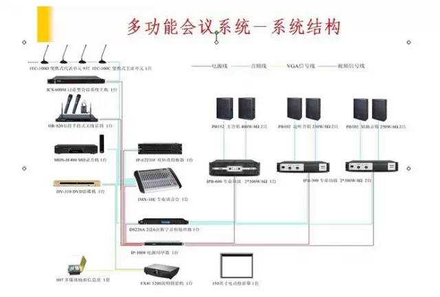 系統通過大屏幕顯示、數字會議、音視頻設備、攝錄設備、視頻會議和會議擴聲等系統的合理配置,將音視頻系統、大屏幕投影、實物投影、燈光控制和攝像機等設備有機地集成,以滿足現代化多功能會議的要求。
