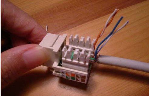 3、將(jiang)全部的線(xian)都壓(ya)進各槽(cao)位后,用(yong)工(gong)具壓(ya)住(zhu)模塊和線(xian),用(yong)力壓(ya)下去,將(jiang)線(xian)卡在模塊里面,并把多(duo)余(yu)的先(xian)頭(tou)剪掉(diao)。