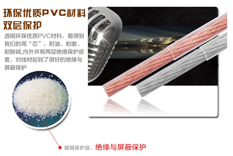 以優質無氧銅為導體,材質好,不易氧化;內部導體均為絞合后擠出,每根銅絲之間連接更加緊密,不會松散,傳輸信號性能更強;一根鍍錫一根裸銅,容易區分正負極,不會導致接錯;透明環保PVC絕緣,外觀晶瑩剔透,美觀舒心,手感柔軟。